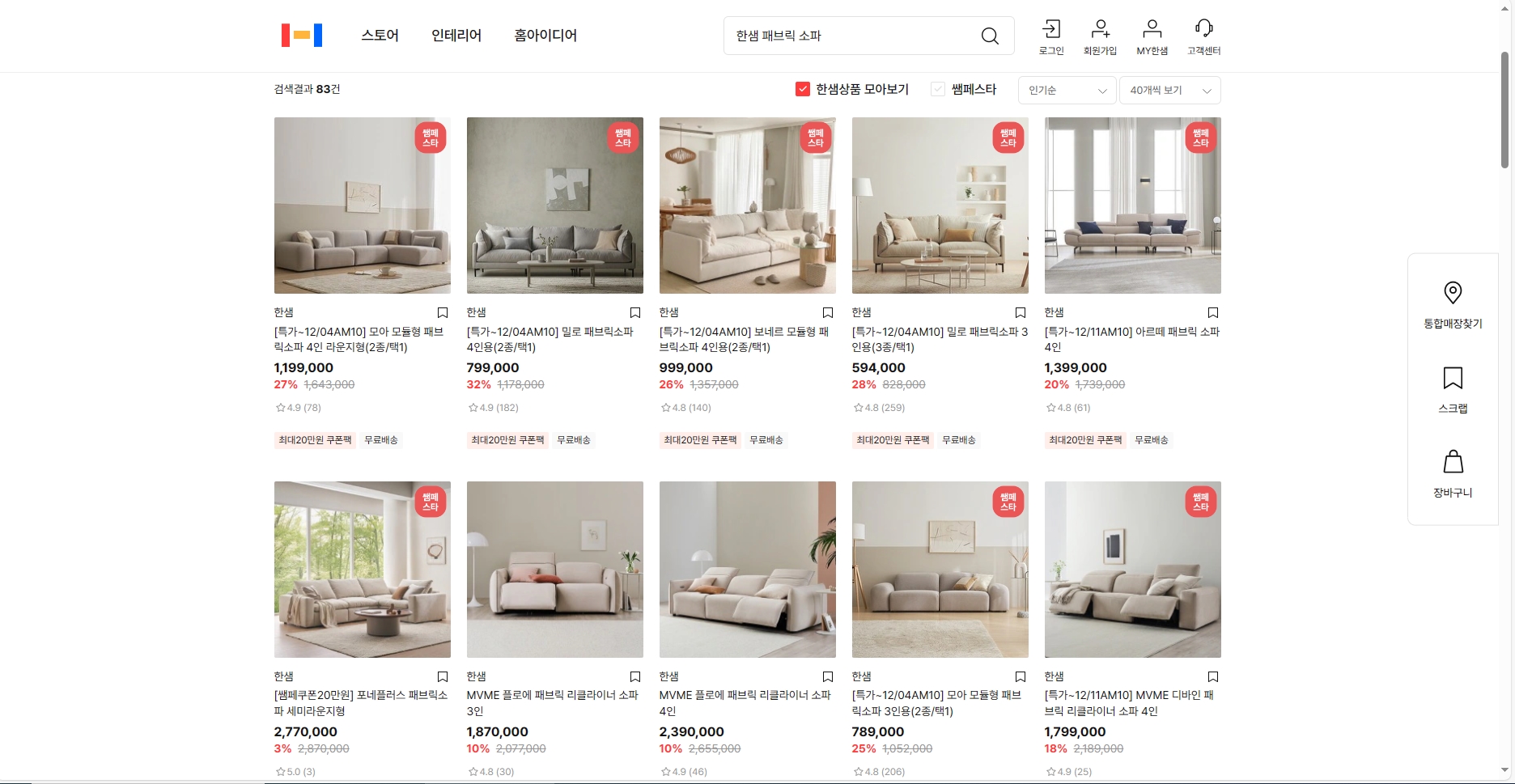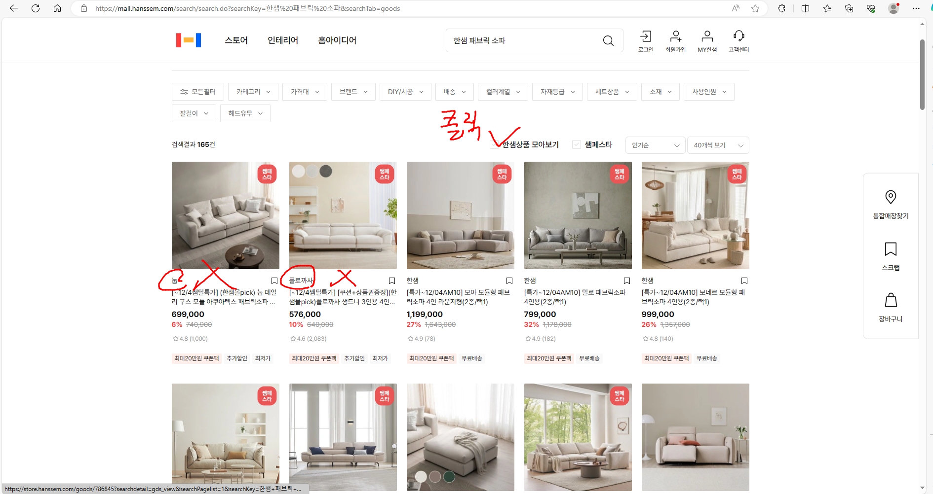 먼저 한샘몰을 통해 패브릭 소파를 검색하시면 눕, 플로까사처럼 다양한 브랜드의 소파가 나오는데 이 제품들은 모두 한샘 제품이 아닙니다.