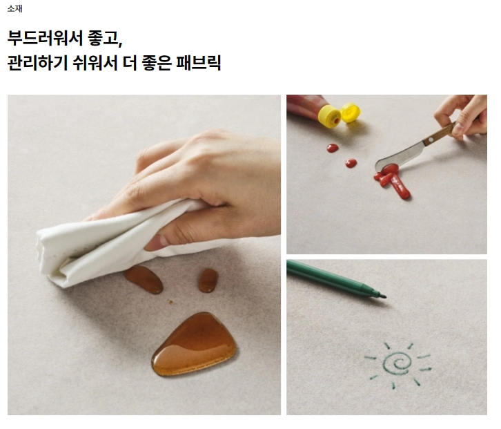 일반적으로 생각하는 원단보다 훨씬 더 부드러운 소재여서 신기하면서도 한편으론 오염에 취약하지 않을까 라는 생각이 들었는데 홈페이지를 보니 커피와 케찹 볼펜을 사용해도 관리가 편하다고 소개를 하고 있네요.