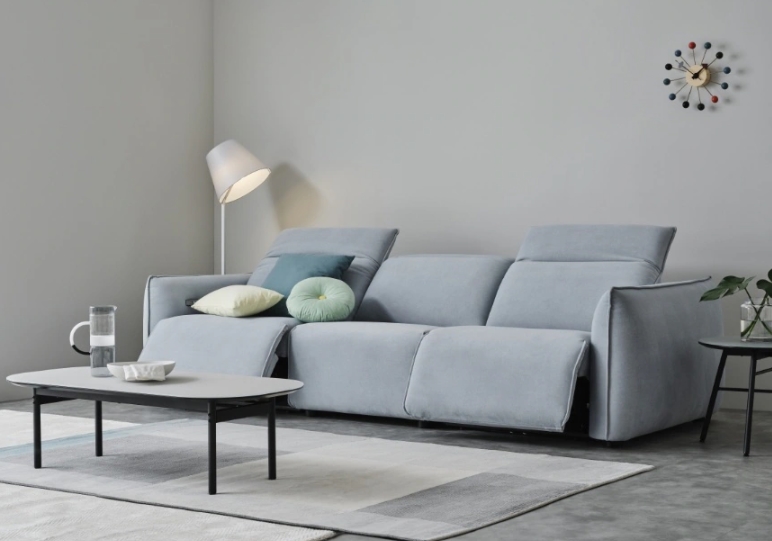 이 제품은 우연히 매장에서 본적이 있는데 미디움 정도의 경도이며 특히 소파 특유의 좌방석 부분 절개선이 없어서 깔끔한 디자인으로 헤드레스트는 수동으로 조절, 리클라이너 가용범위는 다른 소파들보다 넓게 작동한다는 느낌을 받았습니다.
