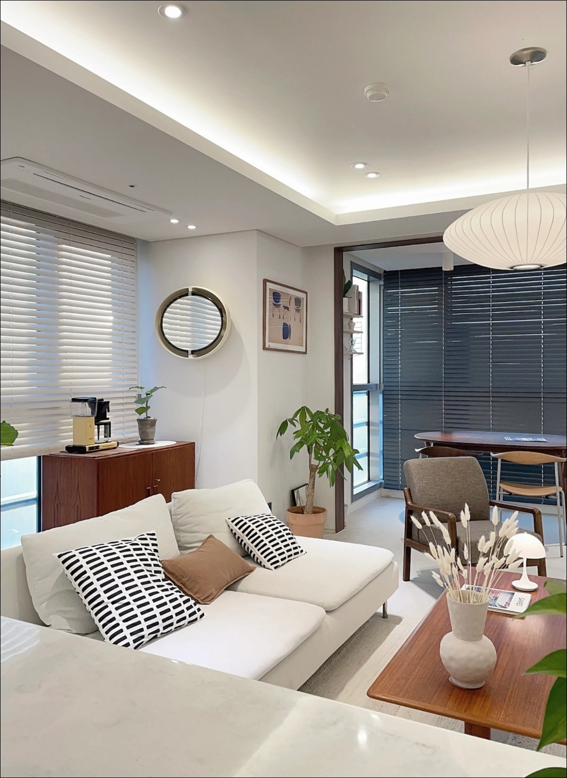 따뜻한 월넛과 오크톤의 가구와 함께 매칭하면 따뜻한 느낌을 주고, 화이트 벽지와 무채색 가구들과 매칭하면 깔끔을 느낌을 주는 다양한 매력을 가지고 있는 것 같습니다.